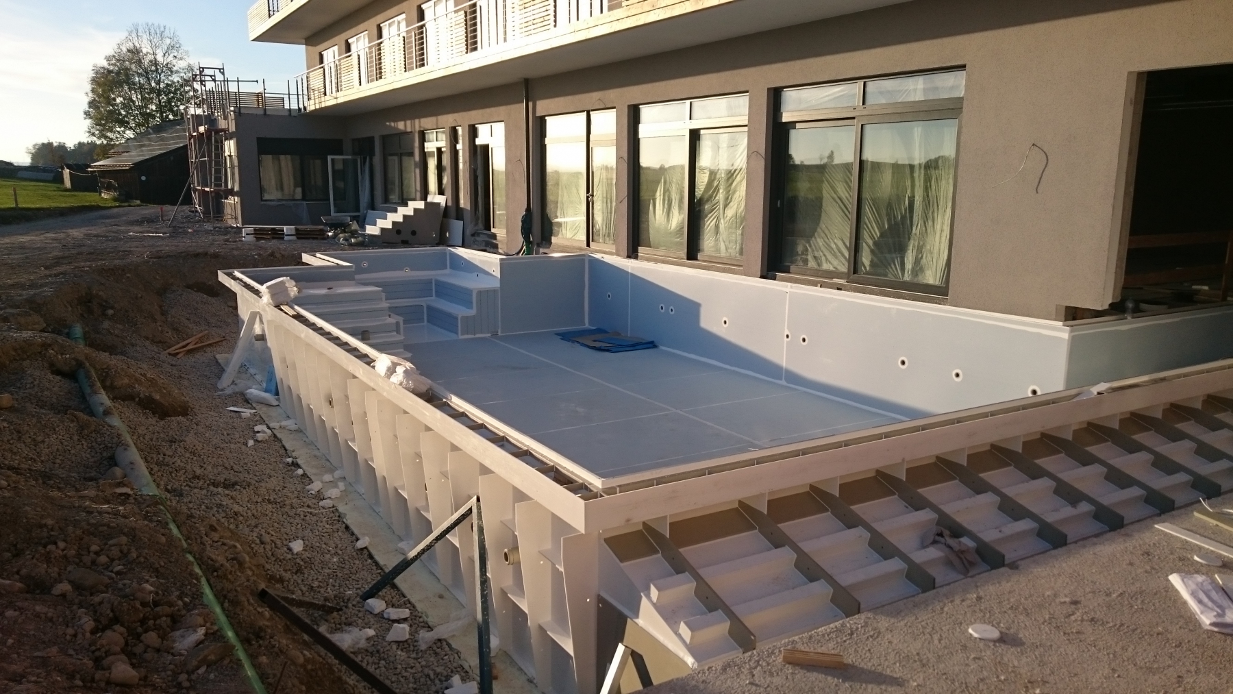 Becken können wir anliefern schon mit wärmegedämmten Beckenmantel von Außen.In die Außenrippen werden Polystyrolplatten versetzt. Der Kunde braucht nich vor Ort die Wärmedämmung selber machen.